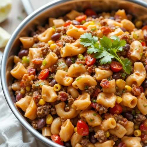 • Combine ingredients in a large bowl: pasta, ground beef, beans, corn, jalapeños, cheese, and veggies.