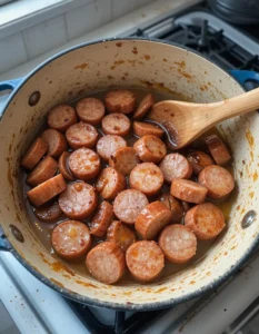 Heat olive oil, sear the sausage slices until golden brown, and set aside. That crispy edge? It’s where the flavor lives.