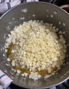 - Melt butter in the same pot, add diced onions, and sauté until softened (about 5 minutes). Add garlic and cook for 1 more minute.
