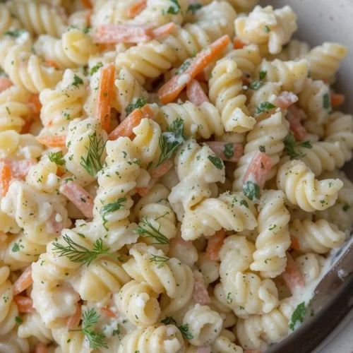 This isn’t your average pasta salad. It’s creamy, it’s garlicky, and thanks to chopped pickles and brine in the dressing, it delivers a briny punch with every bite. The texture is a dream—tender pasta, crunchy carrots, and zippy red onions all tossed in a silky, herb-loaded dressing. Whether it’s for a weekend BBQ, summer picnic, or even weekly meal prep, this one’s a total crowd-pleaser.