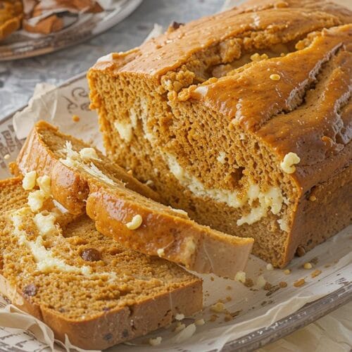 - Moist and flavorful pumpkin bread with a creamy swirl