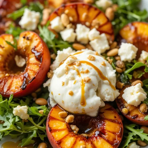 A fresh, flavorful summer salad featuring juicy grilled peaches, creamy burrata, peppery arugula, toasted pine nuts, and a sweet balsamic reduction. Perfect for a light lunch, appetizer, or side dish that feels fancy but is super easy to make!