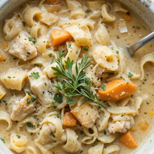 The secret to this creamy chicken noodle soup is the seasonings. A mix of herbs like thyme, rosemary, and bay leaves, with garlic and onion, adds depth of flavor. It’s irresistible.