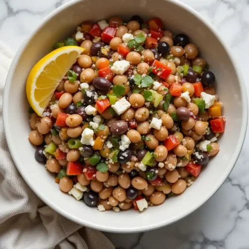 The magic is in the Mediterranean details. The Kalamata olives add a deep, salty richness that’s hard to replicate. Feta cheese brings creaminess and that signature tang. Cucumbers and bell peppers give it that juicy crunch. I love using black beans and cannellini beans together—they each bring a unique texture that keeps the salad interesting.