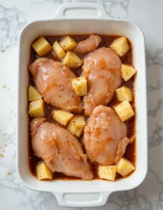 • Pat the chicken dry and arrange it in the prepared baking dish. Scatter pineapple chunks around the chicken.