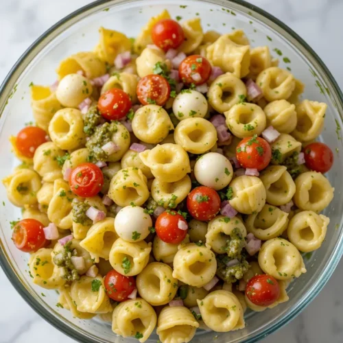 The magic here lies in how simple yet satisfying it is. Cheesy tortellini gets tossed with juicy cherry tomatoes, marinated mozzarella, crunchy red onions, and a good drizzle of Italian dressing (or pesto, if that’s your vibe). That’s it! No fussy steps, no hours in the kitchen—just bold, herby flavors that feel like summer in every bite.